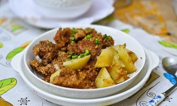 做法分解:鸡肉洗净,剁成小块,用姜片、盐、老抽腌制片刻;土豆洗净、去皮,切成滚刀块,将土豆块和肌肉块放在一起,加上豆瓣酱、米粉和油拌匀;将红椒、青椒洗净,切丝。